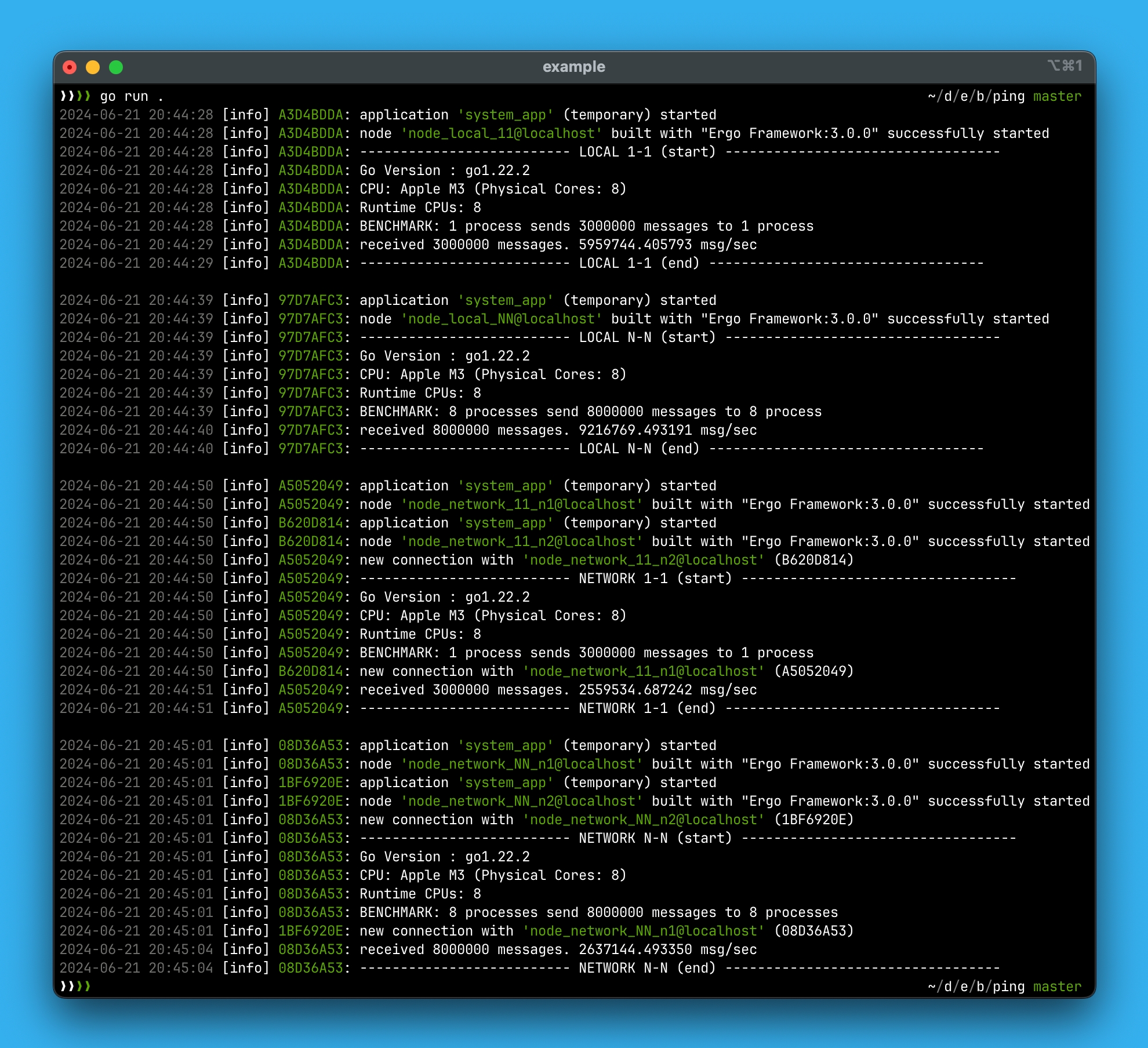 Ergo Framework demonstrates high performance in local message exchange due to the use of lock-free queues within the process mailbox and the efficient use of goroutines to handle the process itself. A goroutine is only activated when the process receives a message; otherwise, the process remains idle and does not consume CPU resources.