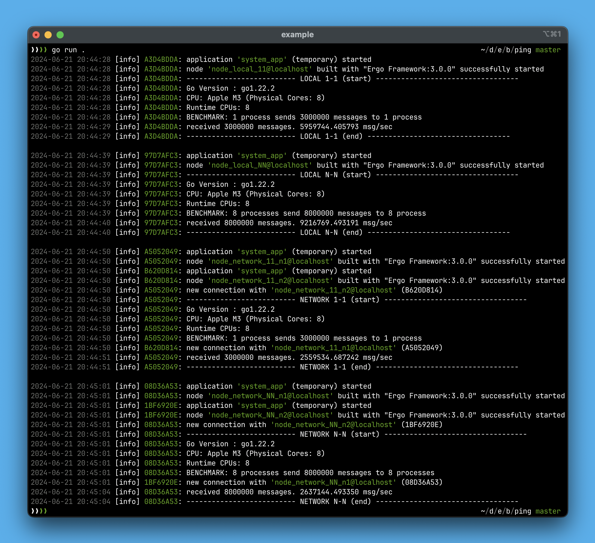 Ergo Framework demonstrates high performance in local message exchange due to the use of lock-free queues within the process mailbox and the efficient use of goroutines to handle the process itself. A goroutine is only activated when the process receives a message; otherwise, the process remains idle and does not consume CPU resources.