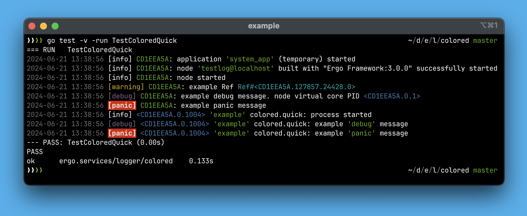 For detailed logger configuration options, see the `colored.Options` struct in the package. For understanding how loggers integrate with the framework, see [Logging](https://docs.ergo.services/basics/logging).