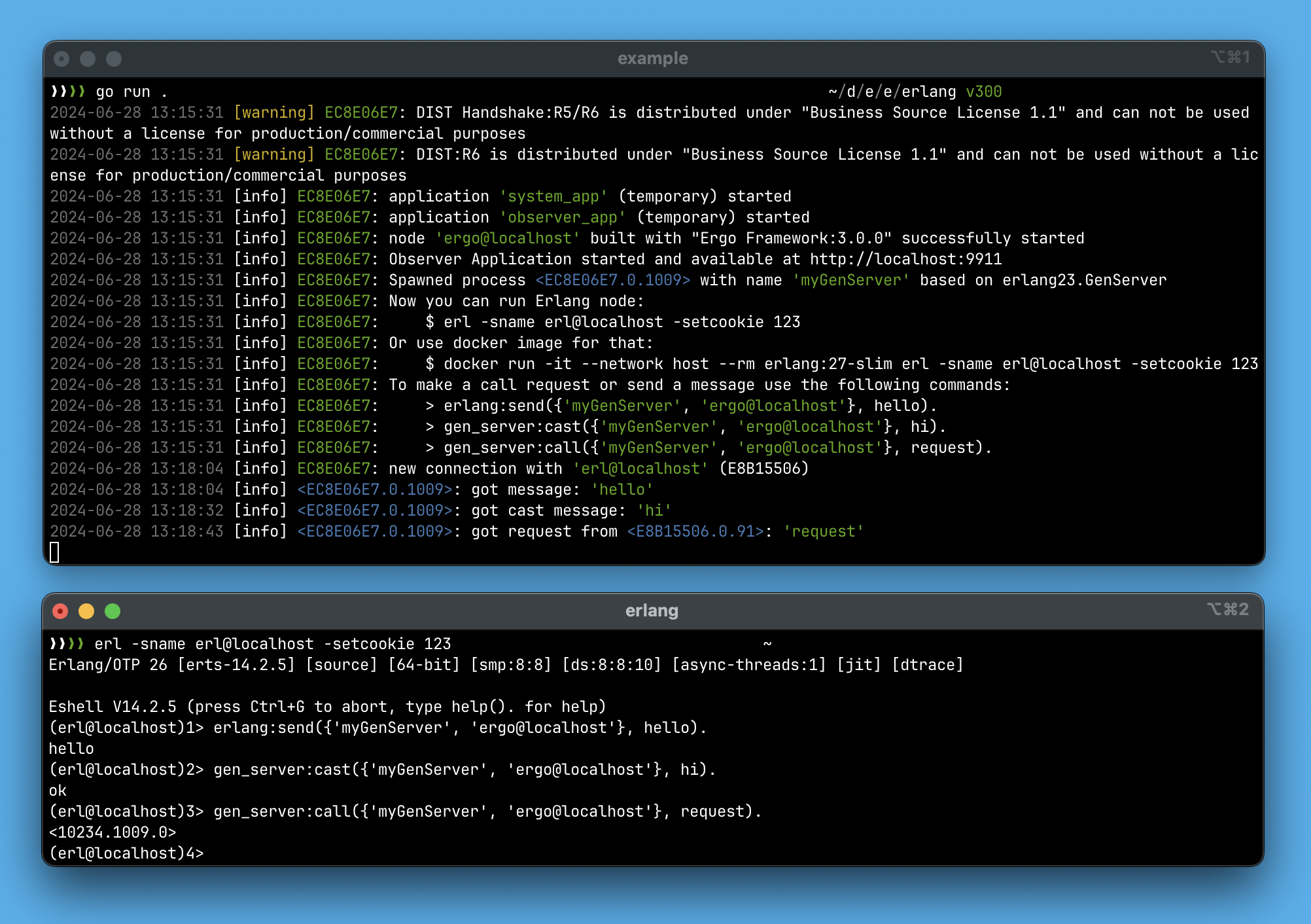 To send regular messages, use the `Send*` methods of the embedded `gen.Process` interface. Synchronous requests are made using the `Call*` methods of the `gen.Process` interface.