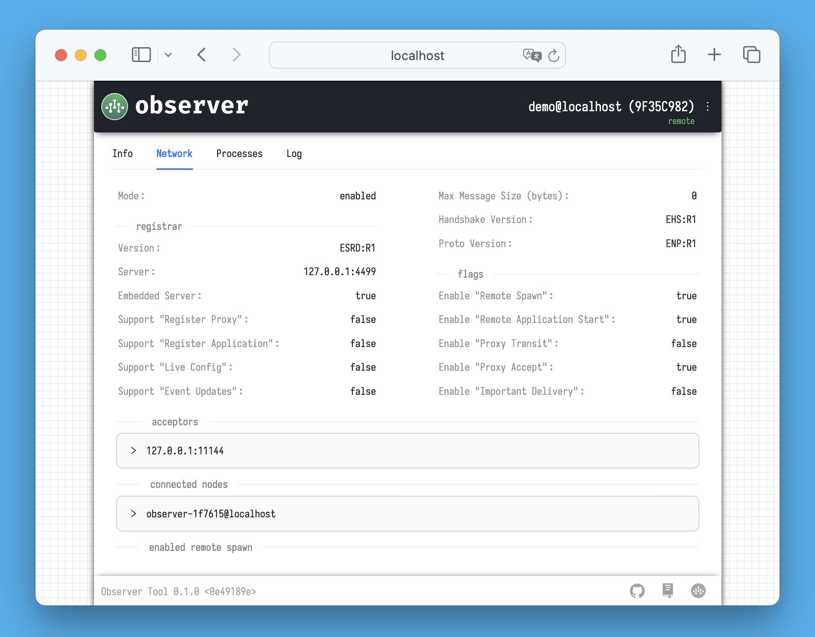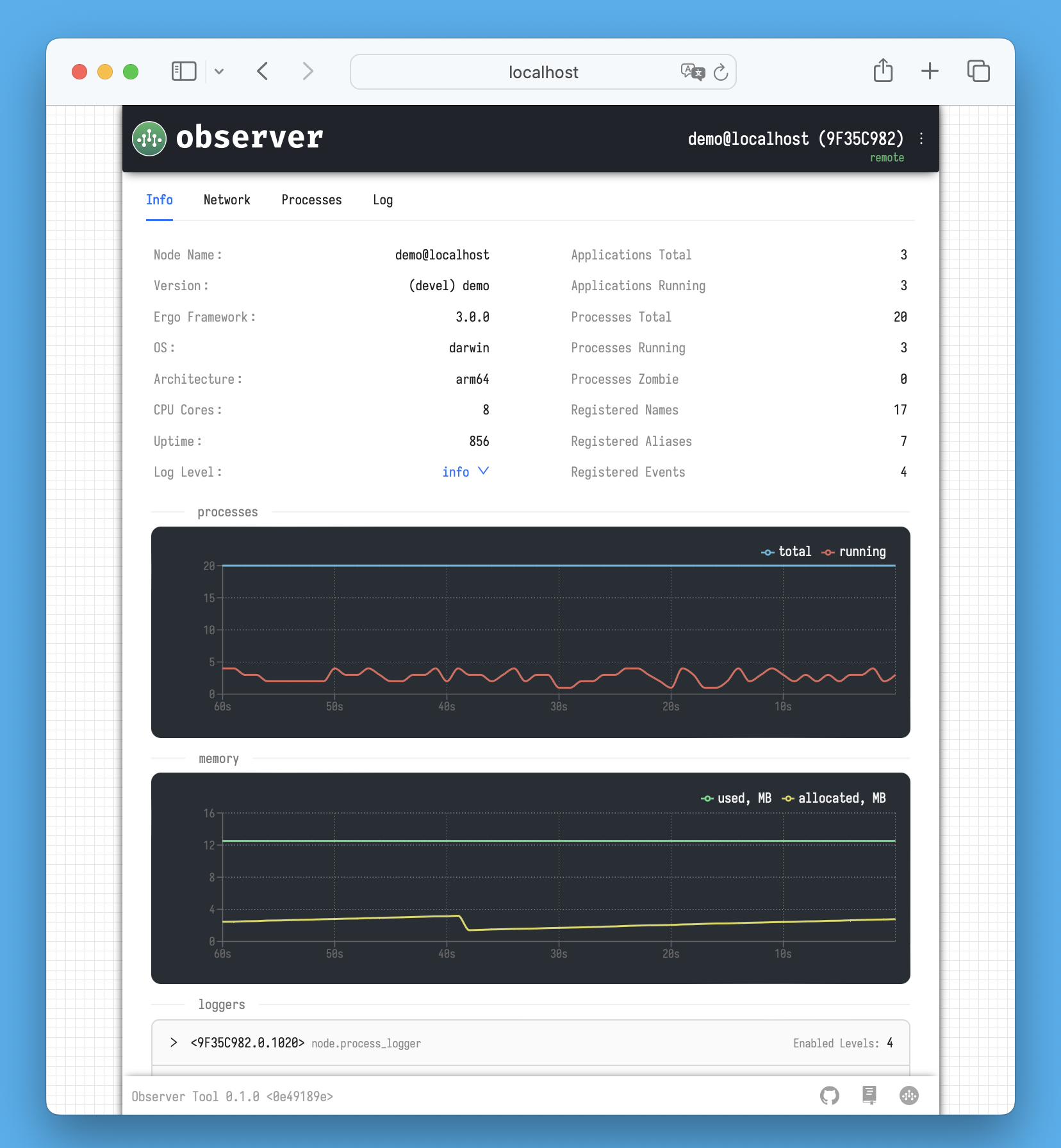 In addition to these details, you can view information about the available loggers on the node and their respective logging levels. For more details, refer to the [Logging](https://docs.ergo.services/basics/logging) section. Environment variables will also be displayed here, but only if the `ExposeEnvInfo` option was enabled in the `gen.NodeOptions.Security` settings when the inspected node was started.