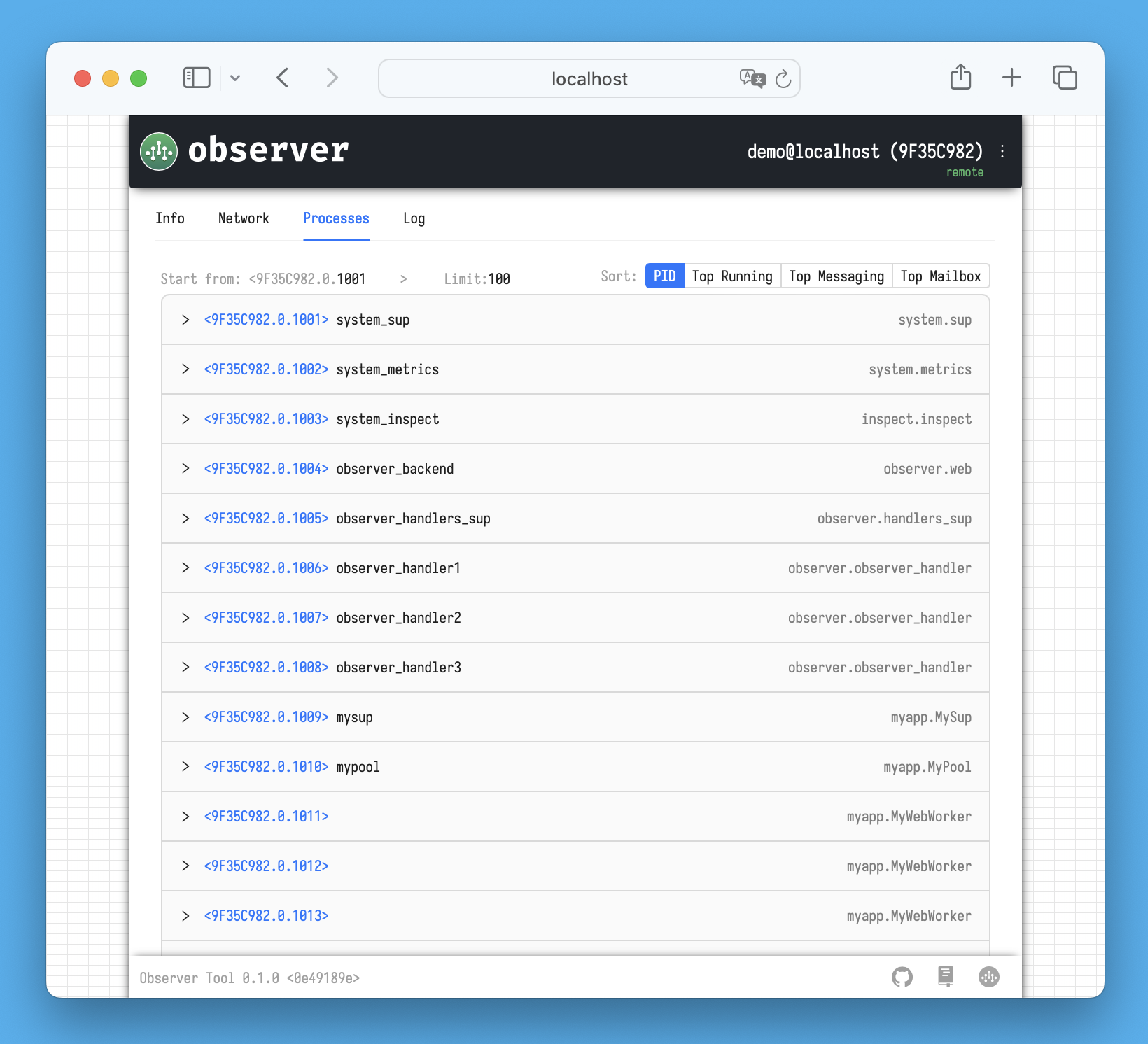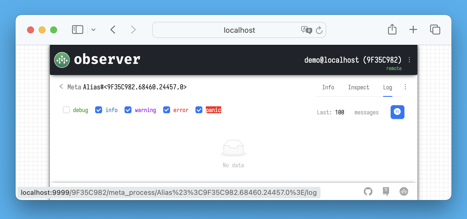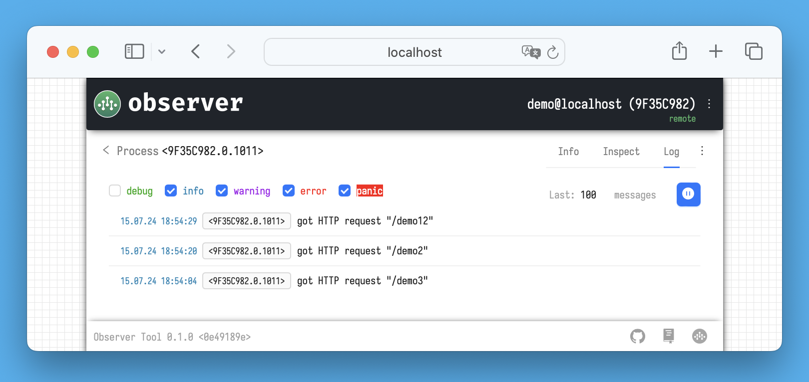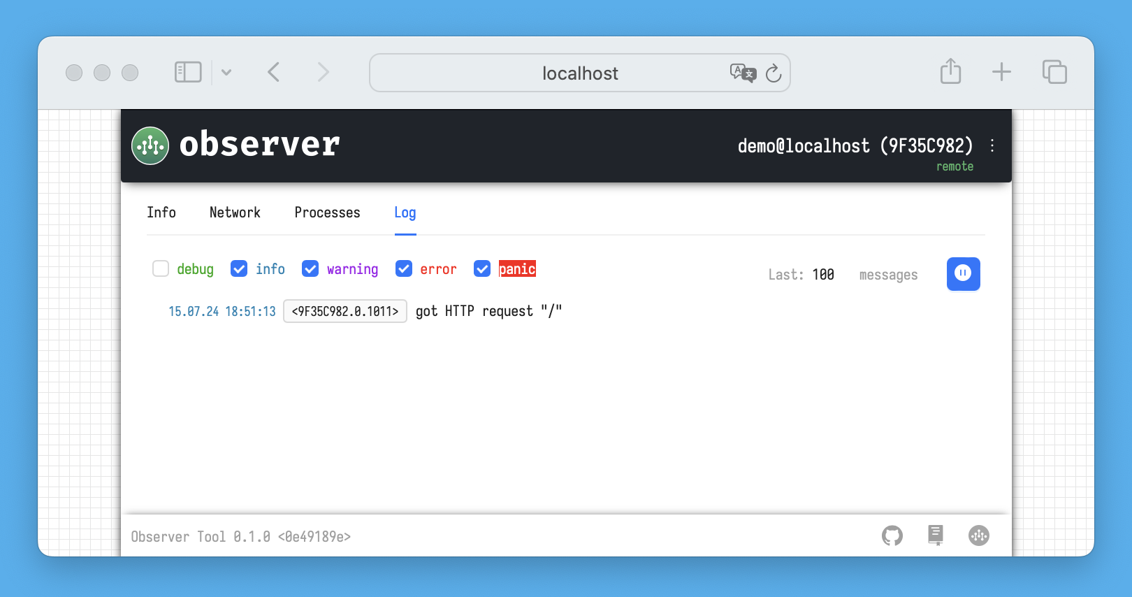 All log messages from the node, processes, network stack, or meta-processes are displayed here. When you connect to the Observer via a browser, the Observer's backend sends a request to the inspector to start a *log process* with specified logging levels (this *log process* is visible on the main **Info** tab).