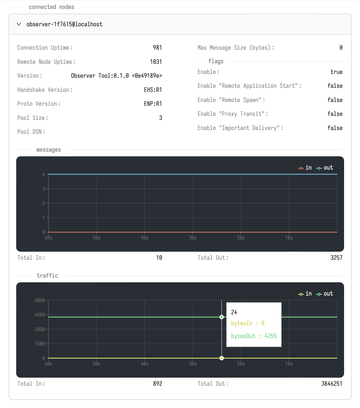 The **Connected Nodes** section displays a list of active connections with remote nodes. For each connection, you can view detailed information, including the version of the handshake used when the connection was established and the protocol currently in use. The **Flags** section shows which features are available to the node when interacting with the remote node.