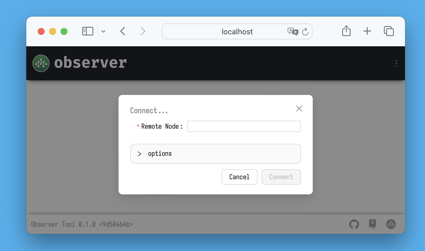 After starting `observer`, it initially has no connections to other nodes, so you will be prompted to specify the node you want to connect to.