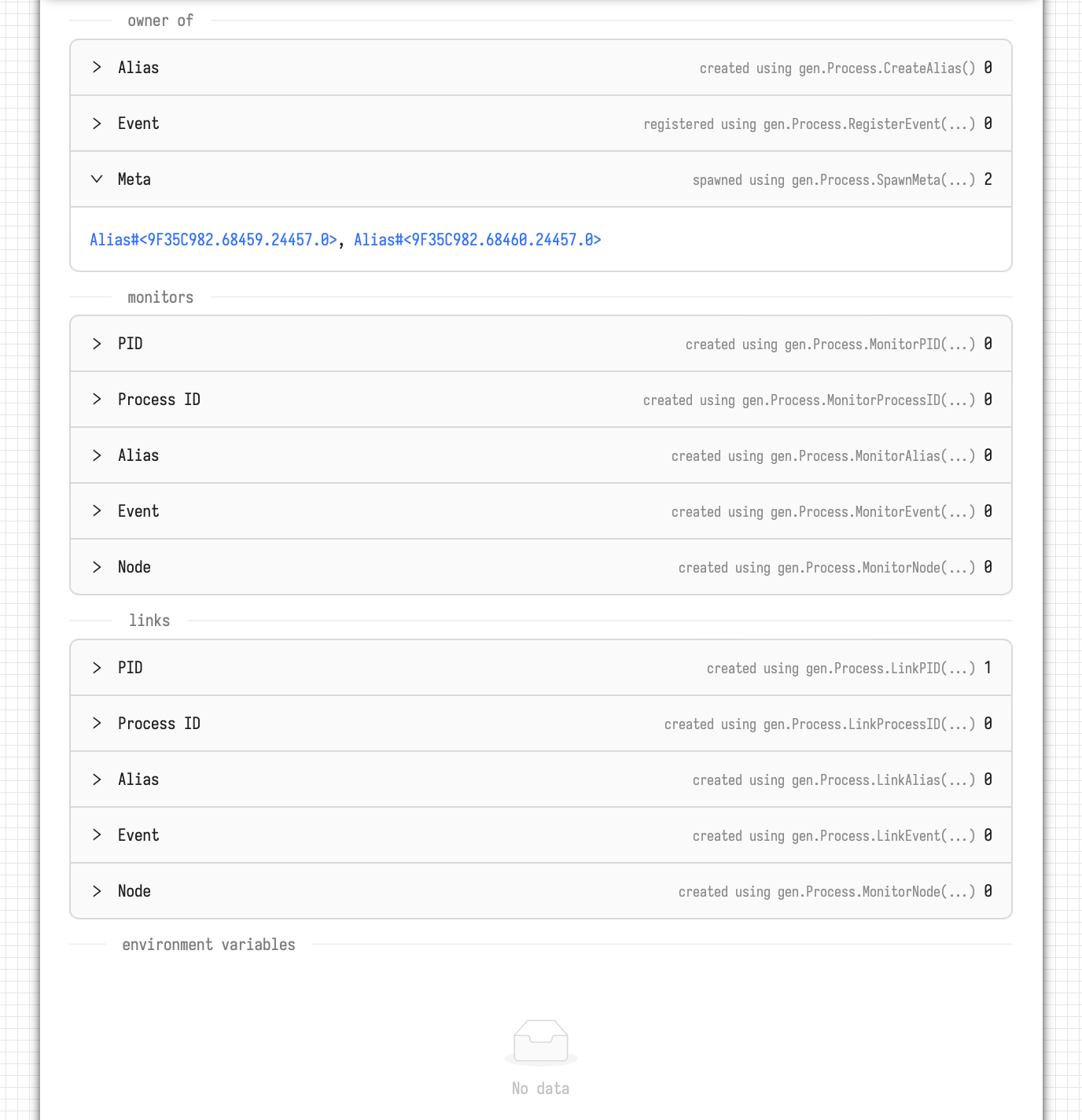 Additionally, you can find detailed information about any **aliases**, **links**, and **monitors** created by this process, as well as any registered **events** and started **meta-processes**.