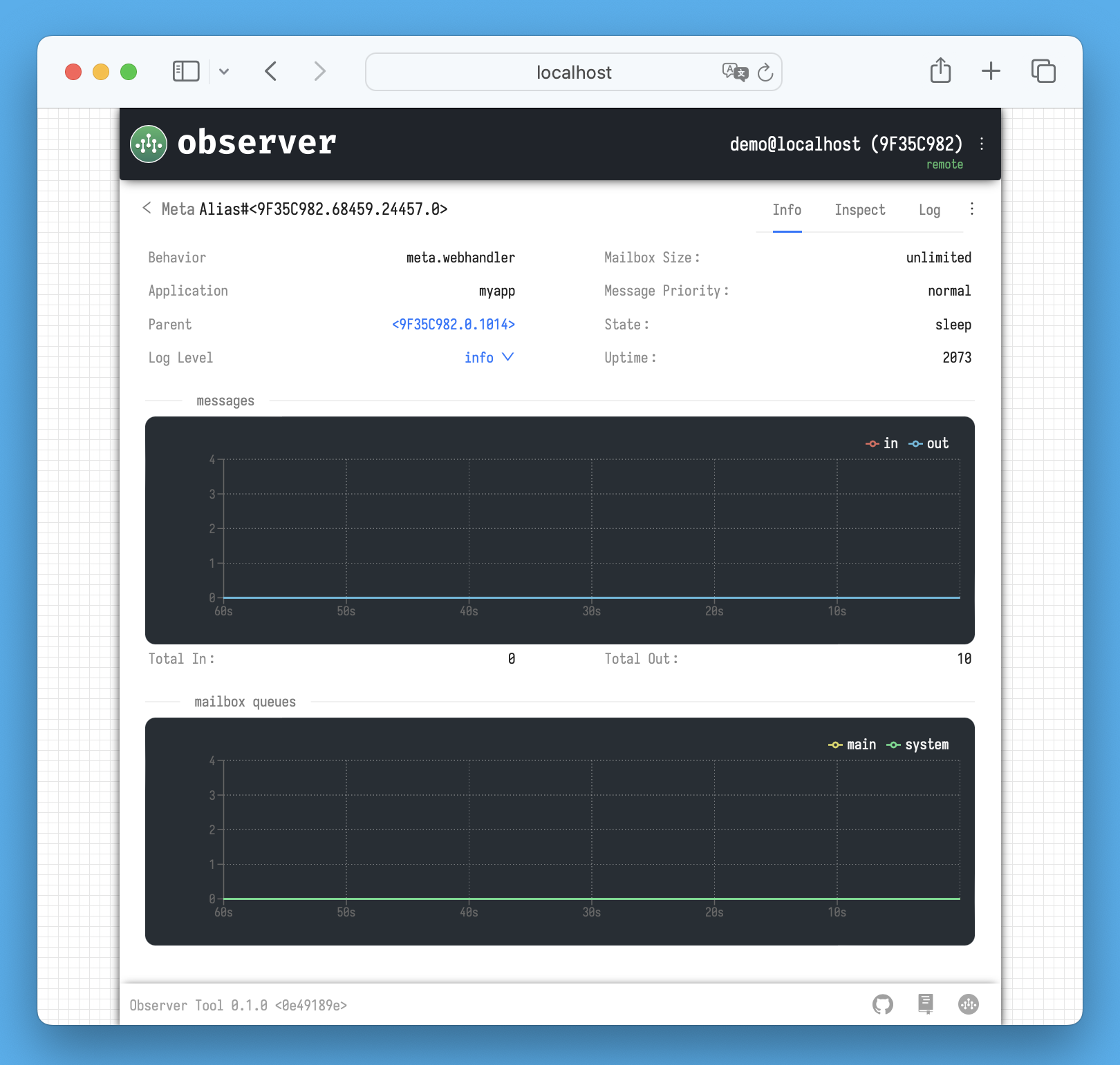 On this page, you'll find detailed information about the meta-process, along with graphs showing data for the last 60 seconds related to incoming/outgoing messages and the number of messages in its mailbox. The meta-process has only two message queues: *main* and *system*.