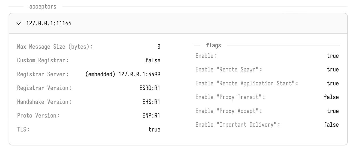 The **Acceptors** section lists the node's acceptors, with detailed information available for each. This list will be empty if the network stack is running in hidden mode.