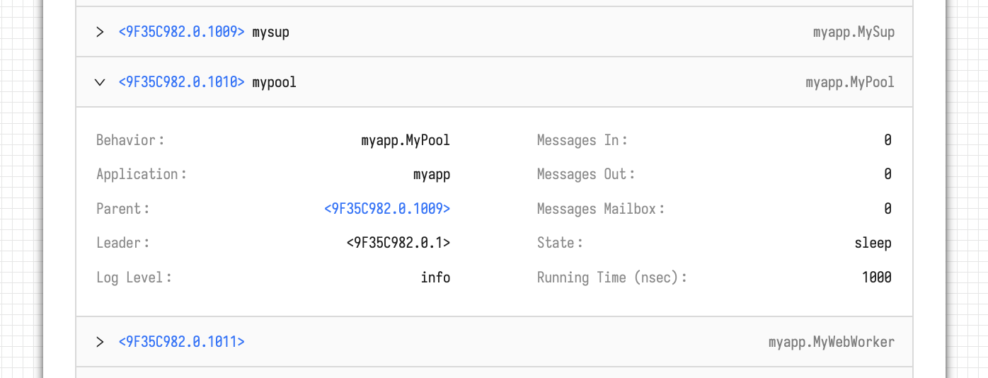 In the example screenshot above, you can see the inspection of a process based on `act.Pool`. Upon receiving the inspect request, it returns information about the pool of processes and metrics such as the number of messages processed.